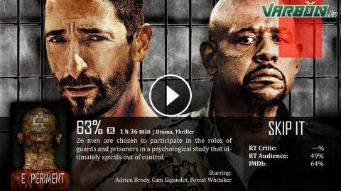 مشاهدة وتحميل فيلم الدراما والاثارة الرهيب The Experiment 2010 مترجم اون لاين يوتيوب التجربة من بطولة النجوم أدريان برودي وكام جيجاندت وفورست ويتاكر تدور احداثة فى اطار من الدراما والاثارة حول مجموعة من العلماء النفسيين يقرروا عمل دراسة على سلوك الإنسان وتعامله مع غيره. حيث يجمع عدد من الأشخاص يتم وضعهم في السجن ويتم تقسيمهم إلى فئتين فئة مساجين وفئة حراس السجن تسير التجربة بصورة جيدة في بدايتها، ولكن تحدث بعض المشاجرات والمشاكل بينهم.. ذا اكسبرمنت The Experiment 2010 بجودة عالية كامل وبدون تقطيع تابعوة فقط فقط على فيديو جواب نت.